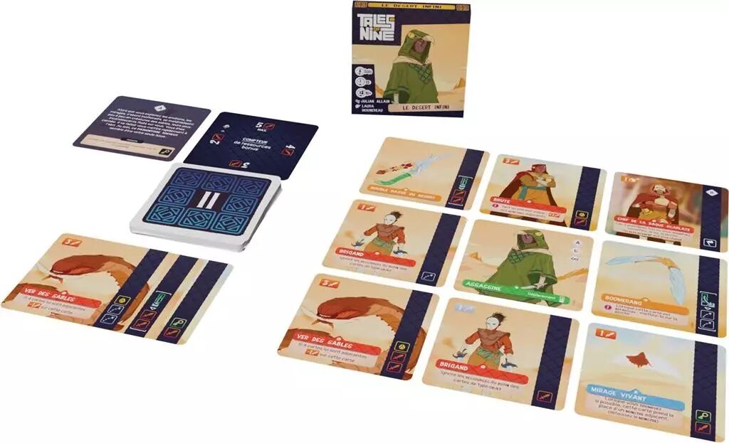 Chaque boîte de Tales of Nine contient 3 chapitres d’une histoire à découvrir sous forme de cartes. Huit d’entre elles sont placées autour de la carte Héros, formant la région ou le donjon à explorer. Déplacez votre héros en utilisant son mouvement de base ou une carte précédemment acquise. Affrontez les monstres en dépensant les ressources nécessaires et venez à bout de chaque chapitre en accumulant des trésors et en visitant les différents lieux.