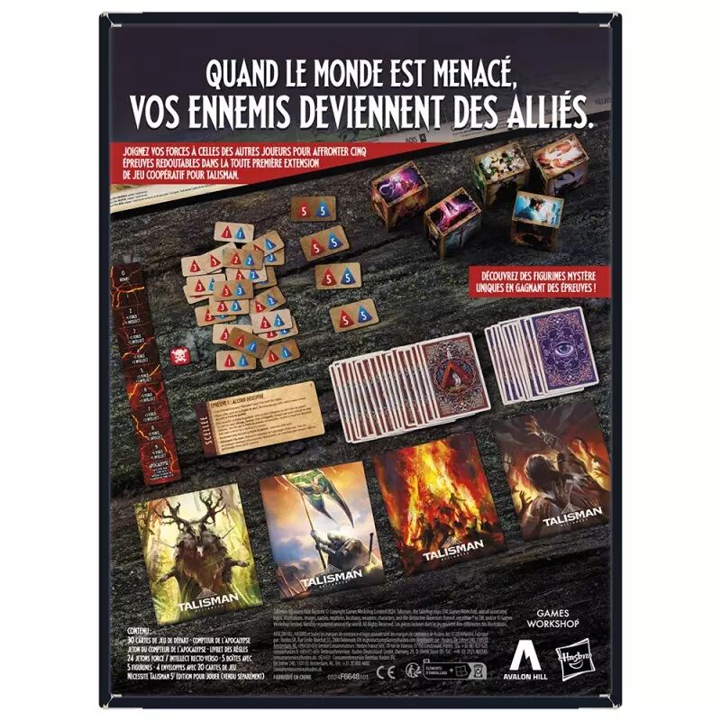 Quand le monde est menacé, les ennemis deviennent des alliés. Dans le jeu coopératif Talisman Alliances : L’appel du destin, on joint ses forces à celles des autres joueurs et on se lance dans une aventure épique pour réussir 5 Épreuve redoutables ! Dans chacune des Épreuves, les joueurs devront placer 2 Talismans sur des Lieux de pouvoir, desceller la Porte du pouvoir et vaincre l'adversaire de cette Épreuve Avec son vaste monde de scénarios possibles, cette extension du jeu de plateau stratégique Talisman pour ados et adultes permet de rejouer à l'infini ! Inclut 30 cartes de jeu de départ, compteur de l'apocalypse, jeton du compteur de l'apocalypse, livret des règles, 24 jetons forces / intellect recto-verso, 5 boîtes avec 5 figurines, 4 enveloppes avec 20 cartes de jeu. Ce jeu d'aventure de table est pour 2 à 6 joueurs à partir 12 ans. (Nécessite le jeu Talisman 5e édition de base pour jouer.