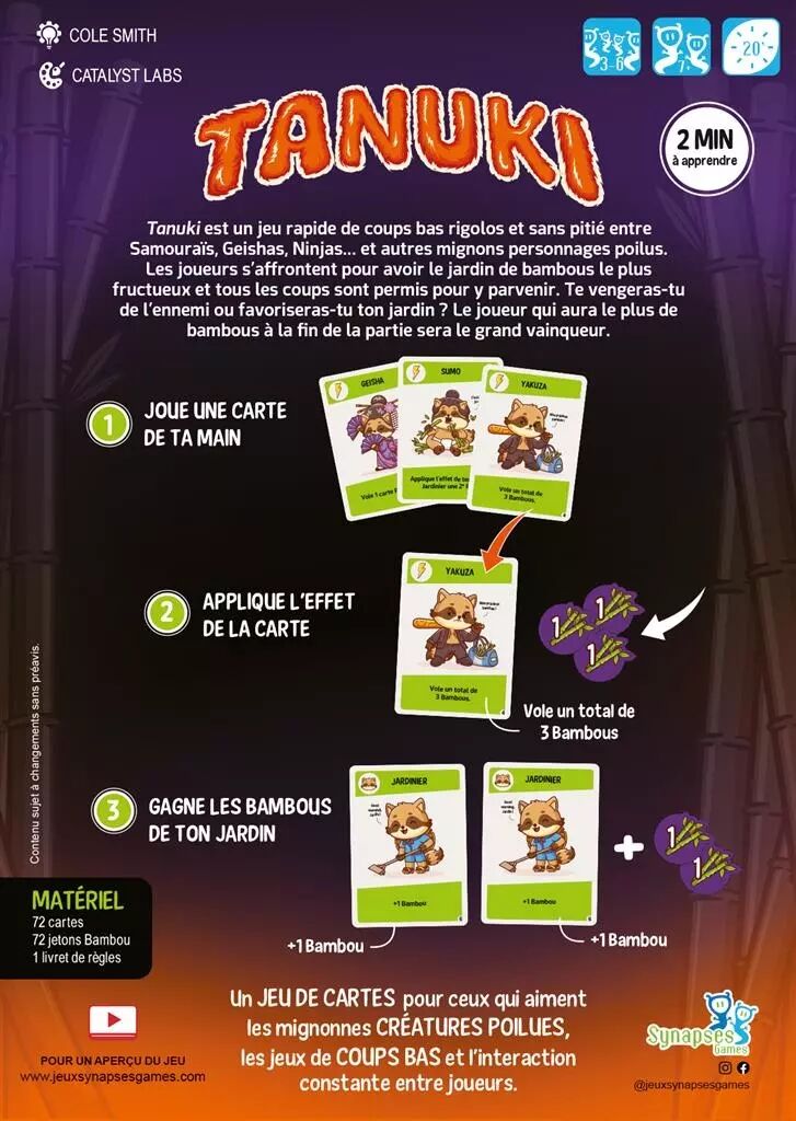 Tanuki est un jeu rapide de Samouraïs, Geishas, Ninjas... et beaucoup de mignonnes choses à fourrure. Les joueurs s'affrontent pour avoir le jardin de bambous le plus productif et posséder le plus de bambous à la fin de la partie !