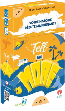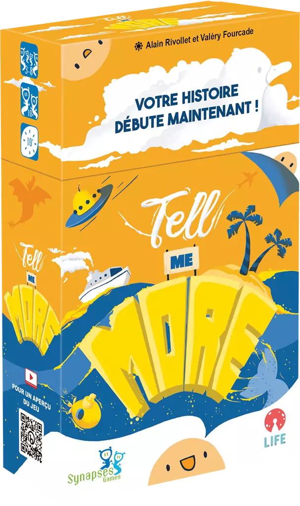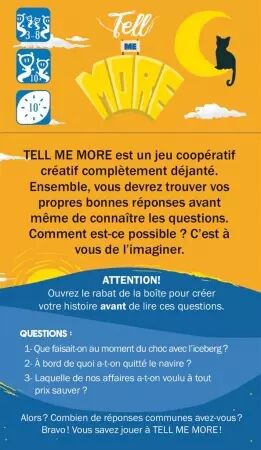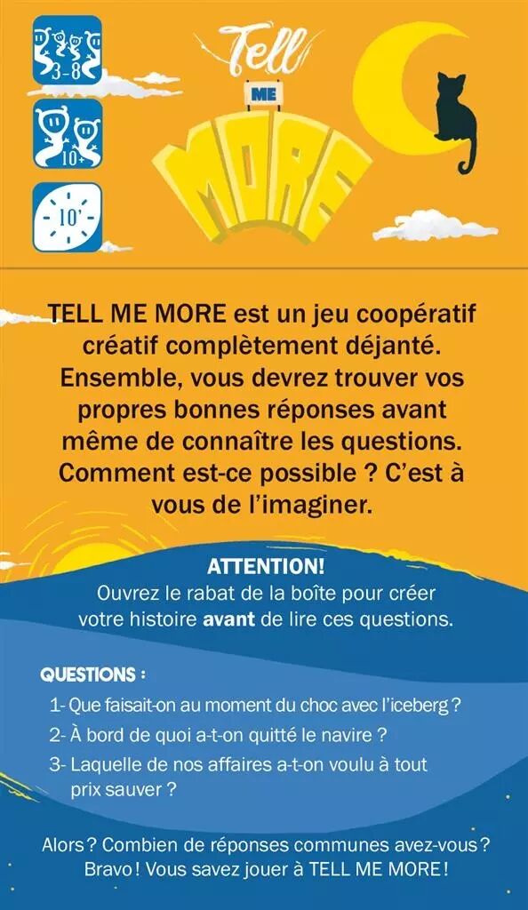 Tell Me More est un jeu coopératif, créatif et loufoque, dans lequel vous allez inventer une histoire selon une situation donnée à l’aide de mots clefs et ainsi répondre aux questions avant même de les connaitre !