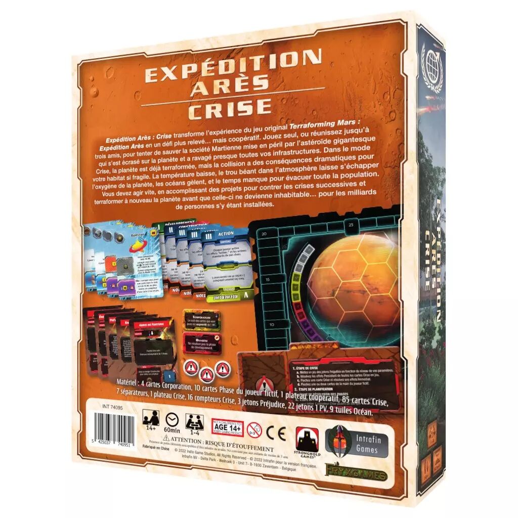 Expédition Arès: Crise transforme l'expérience du jeu original Terraforming Mars Expédition Arès en un défi plus relevé... mais coopératif. Jouez seul, ou réunissez jusqu'à trois amis, pour tenter de sauver la société Martienne mise en péril pas l'astéroïde gigantesque qui s'est écrasé sur la planète et a ravagé presque toutes vos infrastructures. Dans le mode Crise, la planète est déjà terraformée, mais la collision a des conséquences dramatiques pour votre habitat si fragile. La température baisse, le trou béant dans l'atmosphère laisse s'échapper l'oxygène de la planète, les océans gèlent, et le temps manque pour évacuer toute la population. Vous devez agir vite, en accomplissant des projets pour contrer les crises successives et terraformer à nouveau la planète avant que celle-ci ne devienne inhabitable... pour les milliards de personnes s'y étant installées.