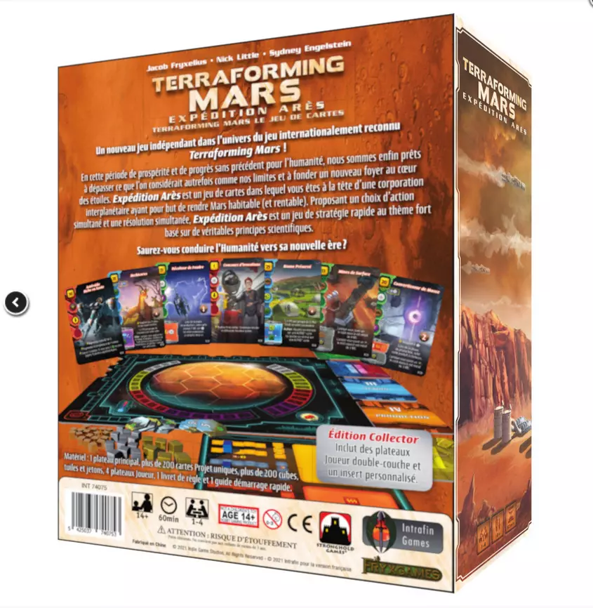 En cette période de prospérité et de progrès sans précédent pour l'humanité, nous sommes enfin prêts à dépasser ce que l'on considérait autrefois comme nos limites et à fonder un nouveau foyer au cœur des étoiles.Expédition Arès est un jeu de cartes dans lequel vous êtes à la tête d'une corporation interplanétaire ayant pour but de rendre Mars habitable (et rentable). Proposant un choix d'action simultané et une résolution simultanée, Expédition Arès est un jeu de stratégie rapide au thème fort basé sur de véritables principes scientifiques.Saurez-vous conduire l'Humanité vers sa nouvelle ère ?