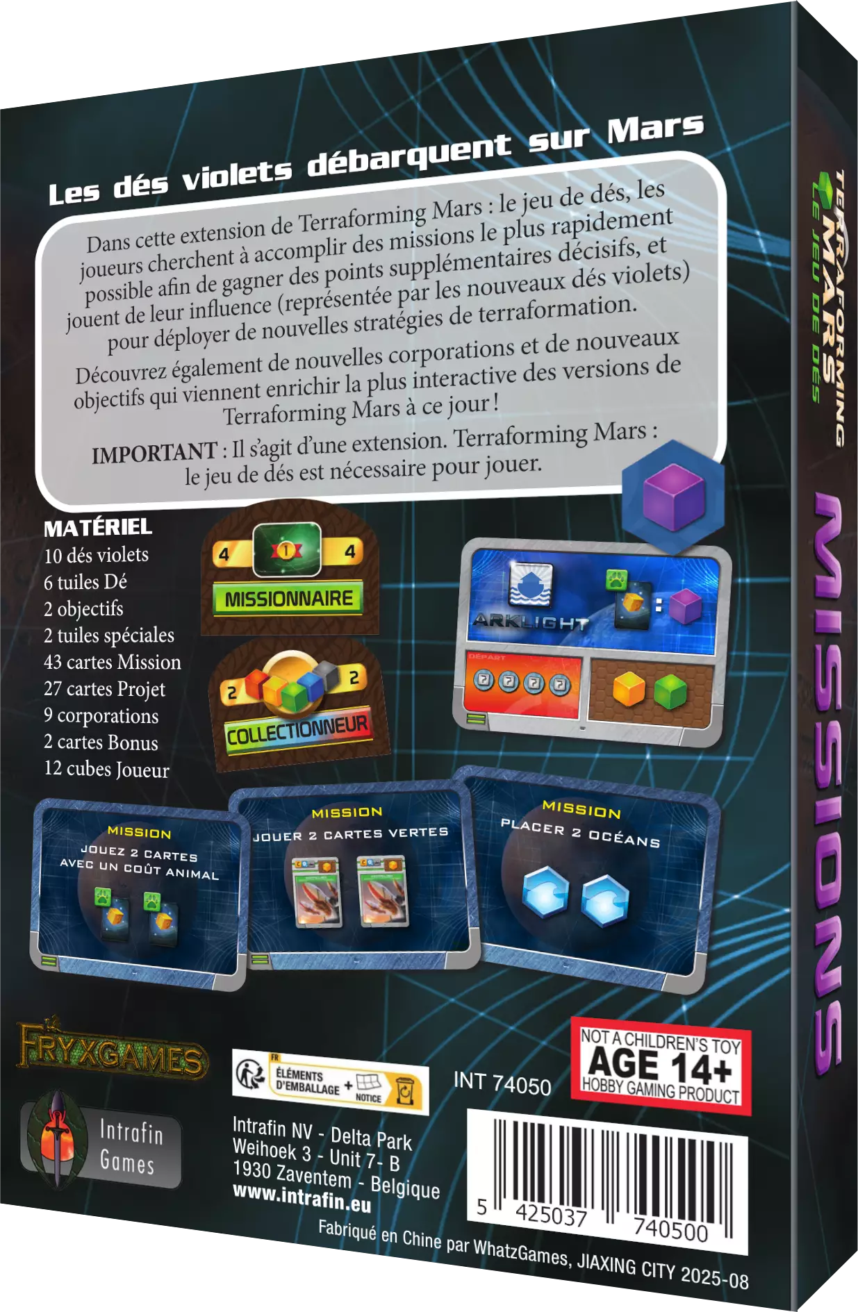 Les 10 dés violets représentent influence croissante joueur. Contrairement dés classiques, violets offrent mécaniques spéciales débloquant approches radicalement différentes. Certains plans de terraformation deviennent optionnels : certains joueurs vont poursuivre influence politique au lieu simple science.