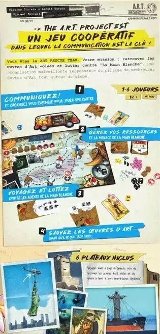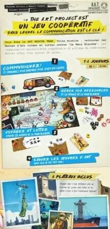 The ART Project est un jeu coopératif : vous jouez tous ensemble contre le jeu. Chaque joueur pioche 2 cartes Mission au début de chaque manche, puis tous les joueurs discutent pour décider de l’ordre du tour : en effet, leurs réserves de Jerrican, Armes, Alliés et Indices sont en commun et leur gestion est primordiale. Quand vous jouez une Mission, vous dépensez des ressources communes et trouvez des indices qui serviront à tous. Essayez de sauver 7 œuvres avant la fin du paquet de Missions…