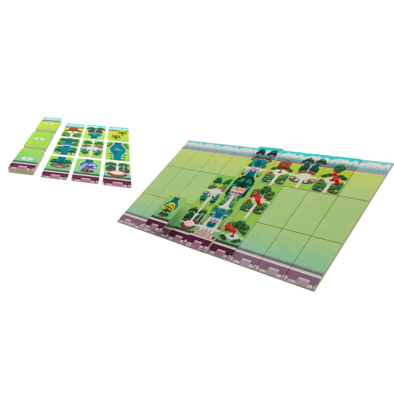 Dans The Gardens, les joueurs piochent des cartes qui illustrent les différents éléments de ce parc et les utilisent pour aménager devant eux leur propre section du parc. Les sections construites par les joueurs comprennent trois rangées : le côté port, les jardins centraux et le côté ville. Les joueurs jouent l’un après l’autre en plaçant, à chaque tour, une carte sur leur plateau jusqu’à l’avoir complété. Après avoir placé une carte, chaque joueur marque des points en fonction de ce que son visiteur a aperçu pendant sa promenade (monuments, arbres, statues, etc.) jusqu’à ce qu’il s’arrête sur la dernière carte placée. Le joueur qui marque le plus de points l’emporte !
