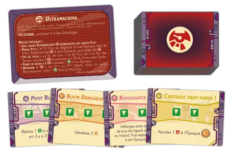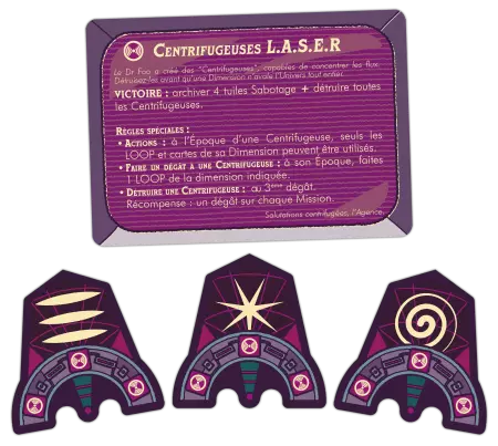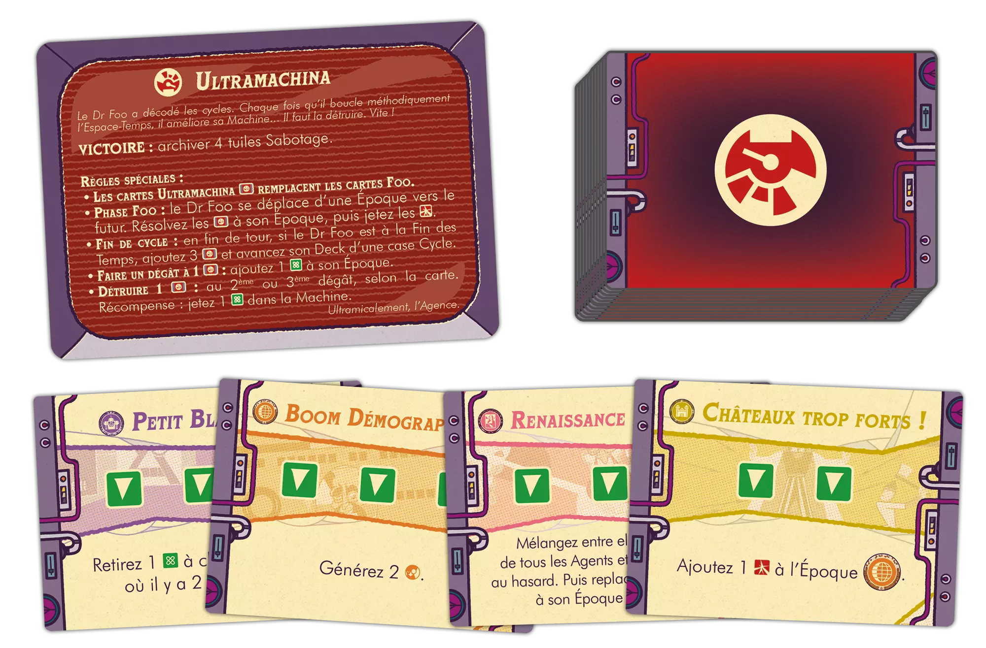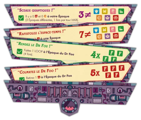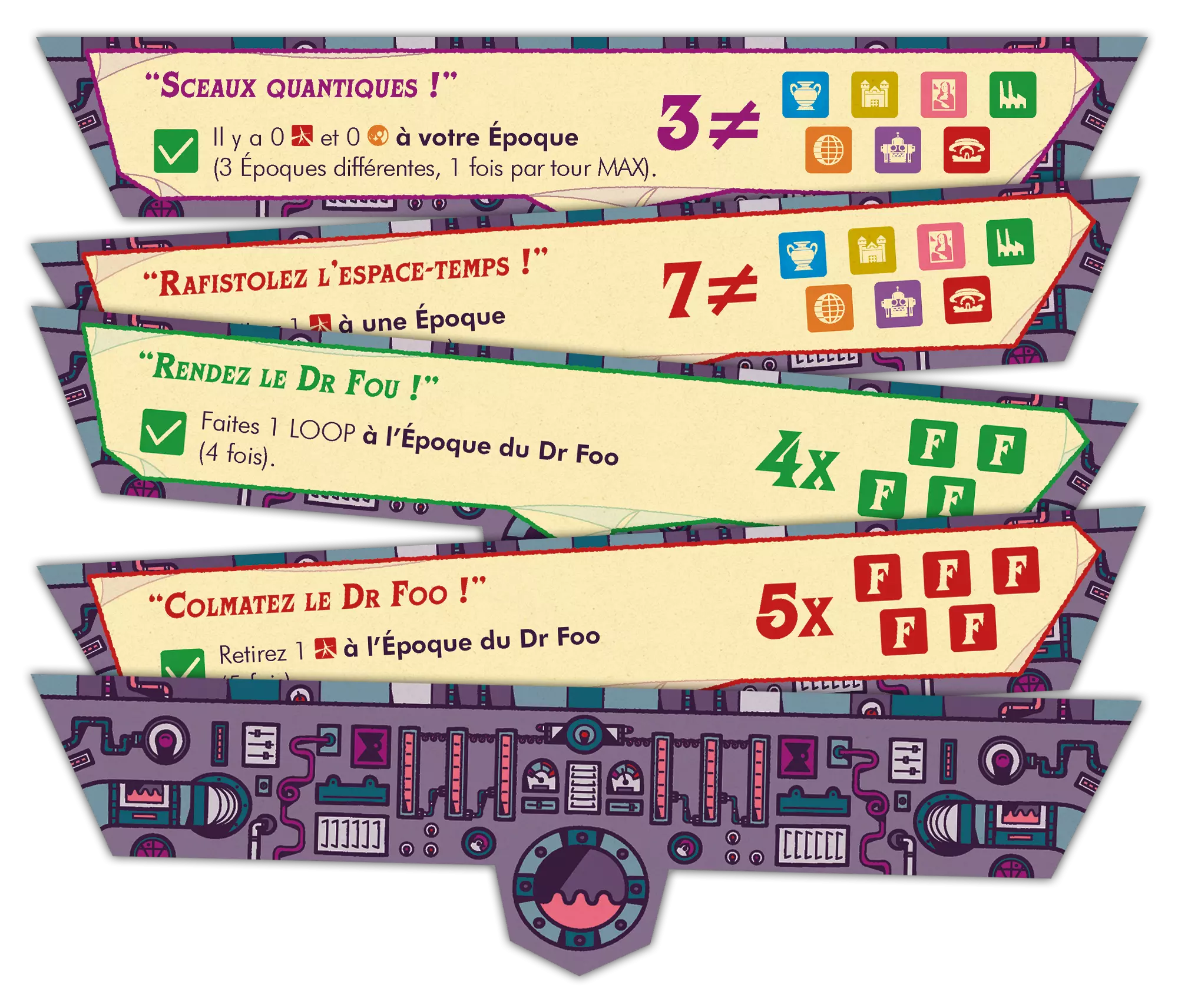 Triomphez ensemble du Dr Foo, en remplissant les objectifs de votre mode de jeu avant que le Dr Foo n'engendre trop de Vortex. Chaque tour, le Dr Foo génère de nouveaux Clones de lui même et se déplace avec sa Machine à une nouvelle époque, avant de jeter dans sa Machine d'autant plus de Failles qu'il y a de clones à cette époque. Trop de failles à une époque engendrent un Vortex. Puis vous pouvez utiliser les 3 cartes Artefact que vous avez en main pour faire des actions : combattre les Clones, supprimer des Failles, générer de précieuses Énergies... grâce à l'Énergie, vous pouvez déplacer votre Agent et même faire des LOOP. Ces boucles temporelles permettent de réutiliser vos cartes dans des enchaînements impressionnants. Mais elles doivent pour cela être d'une même Dimension. tenez-en compte au moment d'ajouter de nouvelles cartes plus puissantes à votre Deck. Un bon usage du LOOP et un solide esprit d'équipe vous permettront peut-être de l'emporter.