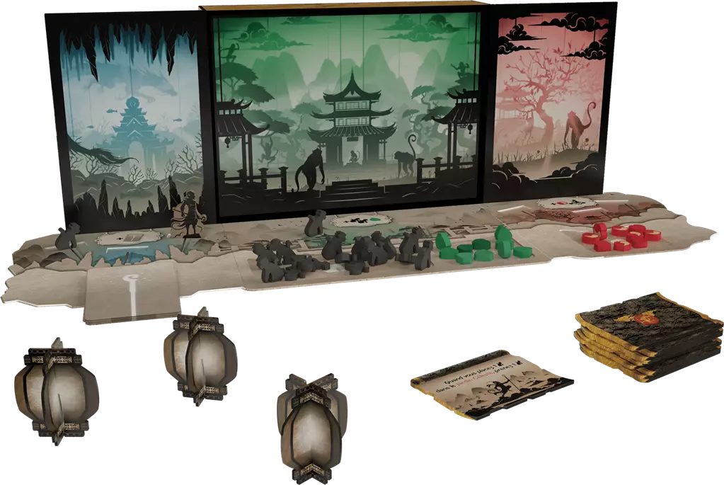Bienvenue dans la légende du Roi Singe, l’un des Quatre livres extraordinaires de la littérature chinoise ! Retrouvez des lieux emblématiques du roman : le Palais de l’Empereur, le Jardin Céleste et le Repaire du Dragon, grâce à la superbe boîte qui sert également de décor de théâtre d’ombres chinoises pour accueillir la partie !
