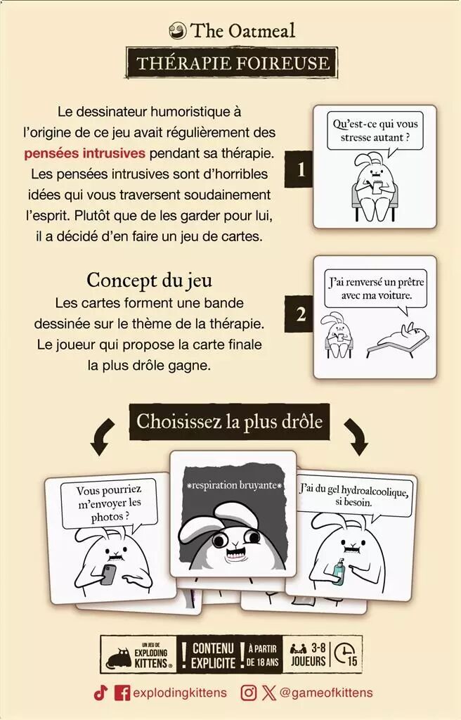 La boîte est une mine d’or : plus de 70 cartes question, 125 cartes réponse et 175 cartes chute forment le cocktail explosif du jeu. Les illustrations signées The Oatmeal offrent une atmosphère graphique à la fois grotesque et irrésistible. Grâce au volume de cartes et à la liberté offerte dans la création des histoires, même après dix parties, "Thérapie foireuse" déborde de situations inédites et de gags qui mettent tout le monde d’accord pour rejouer. L’édition "Extra foireuse" accentue encore le degré de délire et promet un renouvellement bluffant des parties.
