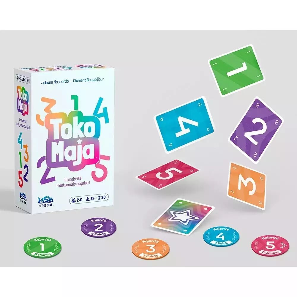 Toko Maja, kezako ? Dans ce jeu de cartes jouable de 2 à 6 joueurs (et même en équipe !) , il faudra réaliser le plus de brelans possibles pour l'emporter. A chaque tour vous pourrez récupérer la carte visible de l'une des trois défausses, ou piocher deux nouvelles cartes dans la pile, en garder une et défausser l'autre. Vous pourrez poser des brelans à partir des cartes de votre main ou en posant trois cartes identiques au sommet des trois défausses (variante brelan de table, que l'on recommande chaudement !).