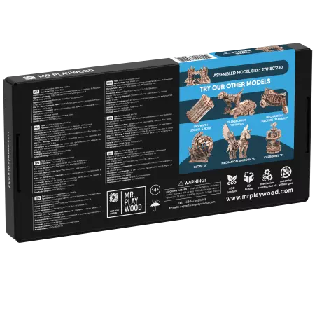 Ce jeu de construction peut être assemblé sans colle, la boîte contient tout ce qu'il vous faut dont un outil universel qui peut être utilisé pour dégager les pièces des planches sans les abimer, de monter les engrenages sur les axe et effectuer des mesures.