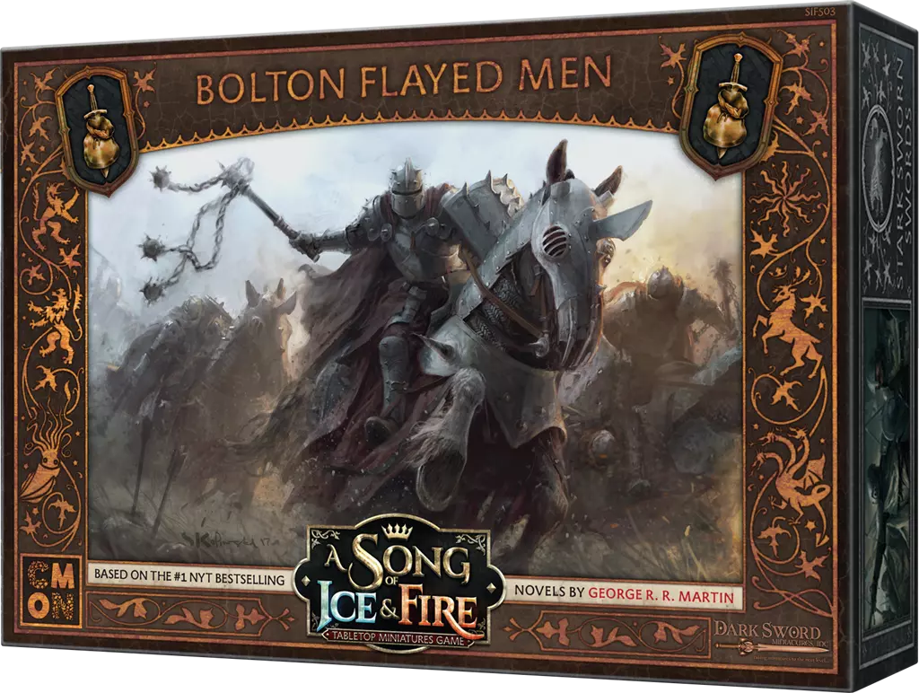 Dans la Guerre des Cinq Rois, ceux que l’on nomme les Écorchés forment les rangs d’une cavalerie plus lourde que la plupart de celles combattant sous des bannières pourtant plus prestigieuses. Équipés de robustes armures d’acier (noirci, bien évidemment), de grands boucliers et de lourdes bardes pour leurs chevaux, les Écorchés peuvent effectuer des charges dévastatrices et tenir le front pour un temps limité. Le fléau de guerre, leur arme de prédilection, est capable d’anéantir les meilleures défenses, mais c’est encore leur apparence terrifiante qui constitue leur meilleur atout.
