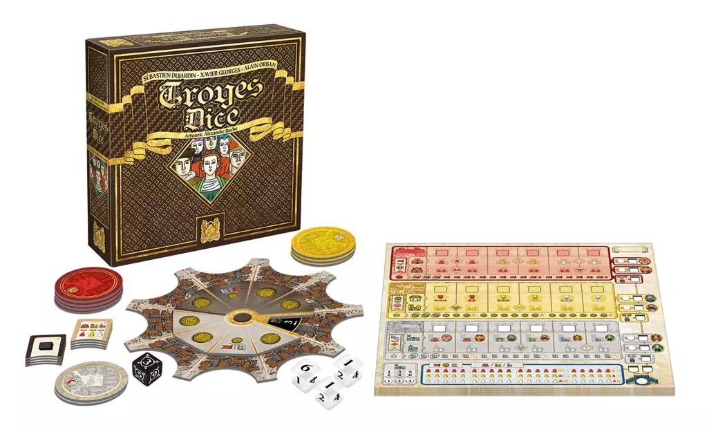 Troyes Dice vous invite à découvrir l'histoire de la ville de Troyes au cours du Moyen Âge. La société est alors organisée autour de trois ordres : les nobles, les civils et les religieux. Aux premiers incombe la charge de protéger les terres, aux seconds de fournir les biens essentiels à la vie de la cité et aux derniers, la mission de veiller à l'éveil spirituel ainsi qu'au développement des connaissances. Mettez à profit les 8 journées que dure une partie pour lutter contre les événements, ouvrir des échoppes dans la grande Halle ou participer à l'édification de la Cathédrale. Attelez-vous également à la construction des 3 bâtiments de fonction de la ville : le Palais des comtes, l'Hôtel de ville et l'Évêché.