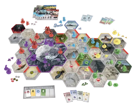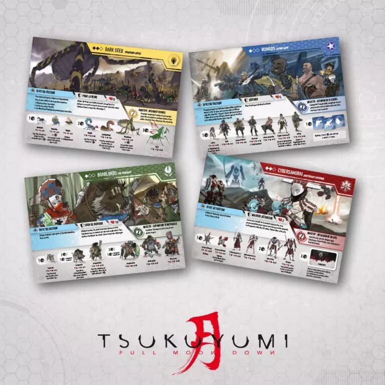 Choisissez une faction, partez à la conquête de nouveaux territoires et livrez bataille pour l'emporter sur vos rivaux. TSUKUYUMI - CHUTE DE LUNE est un jeu de stratégie qui ne laisse aucune place à la chance, forçant les joueurs à rivaliser d'ingéniosité et de sens tactique pour atteindre la victoire. Ce jeu contient 4 factions de base : les Nomades, la Nuée noire, les Cybersamurai et les Seigneurs sangliers