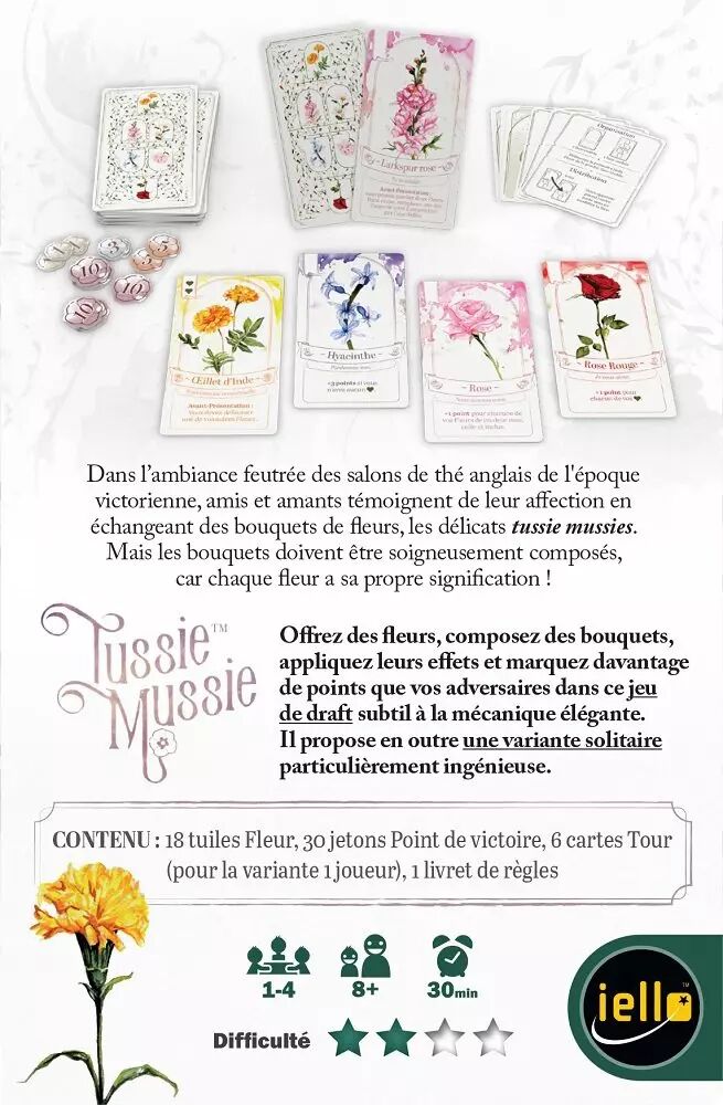 Tussie Mussie est un jeu de cartes particulièrement élégant qui invite les joueurs à s'échanger des cartes représentant des fleurs, chacune ayant évidemment sa propre signification... et ses effets. Le but du jeu consiste à obtenir le plus de points au terme de 4 manches.