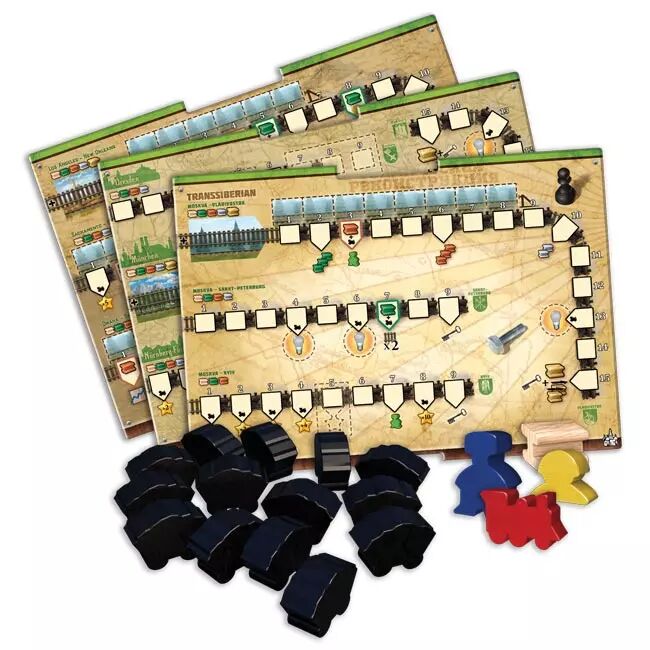 Ce jeu contient Russian Railroads, ainsi que German Railroads et American Railroads, en plus de matériels promotionnels et d’une version solo !