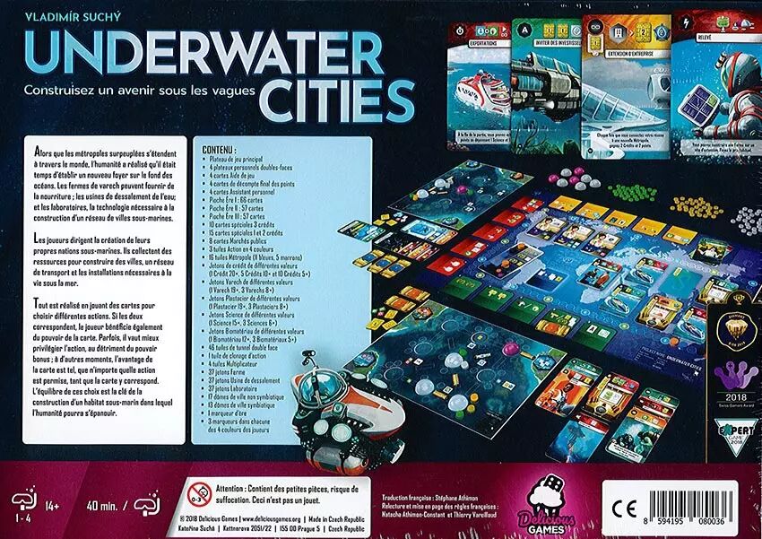Les joueurs s'affrontent pour construire les meilleures zones sous-marines habitables en créant un réseau de villes, de fermes d'algues, de laboratoires, d'usines de déssalement et de tunnels de transport, Le principe de base du jeu est le placement de carte, Les joueurs jouent les cartes dans des emplacements, idéalement de la même couleur, pour bénéficier d'actions et de Bonus leurs permettant de récolter des matières premières, construire des dômes urbains, des tunnels et des bâtiments de production dans leur zone sous-marine personnelle, De votre succès dépend l'avenir de l'humanité, Underwater Cities à obtenu le prix Diamant d'Or 2019.