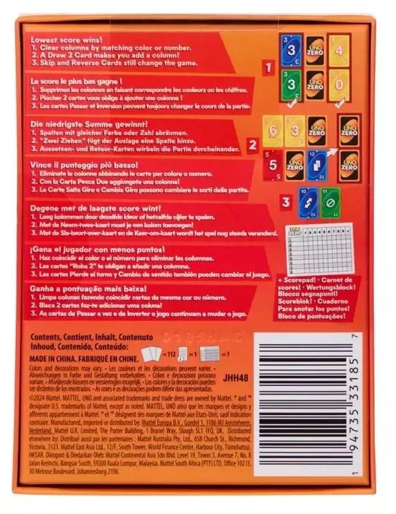 Uno Zero réinvente le célèbre jeu de cartes avec une mécanique qui inverse l’objectif : au lieu de se débarrasser de toutes ses cartes, il faut arriver à zéro points en combinant habilement valeurs et couleurs. Ce changement subtil mais profond rafraîchit l’expérience tout en restant accessible et fun.