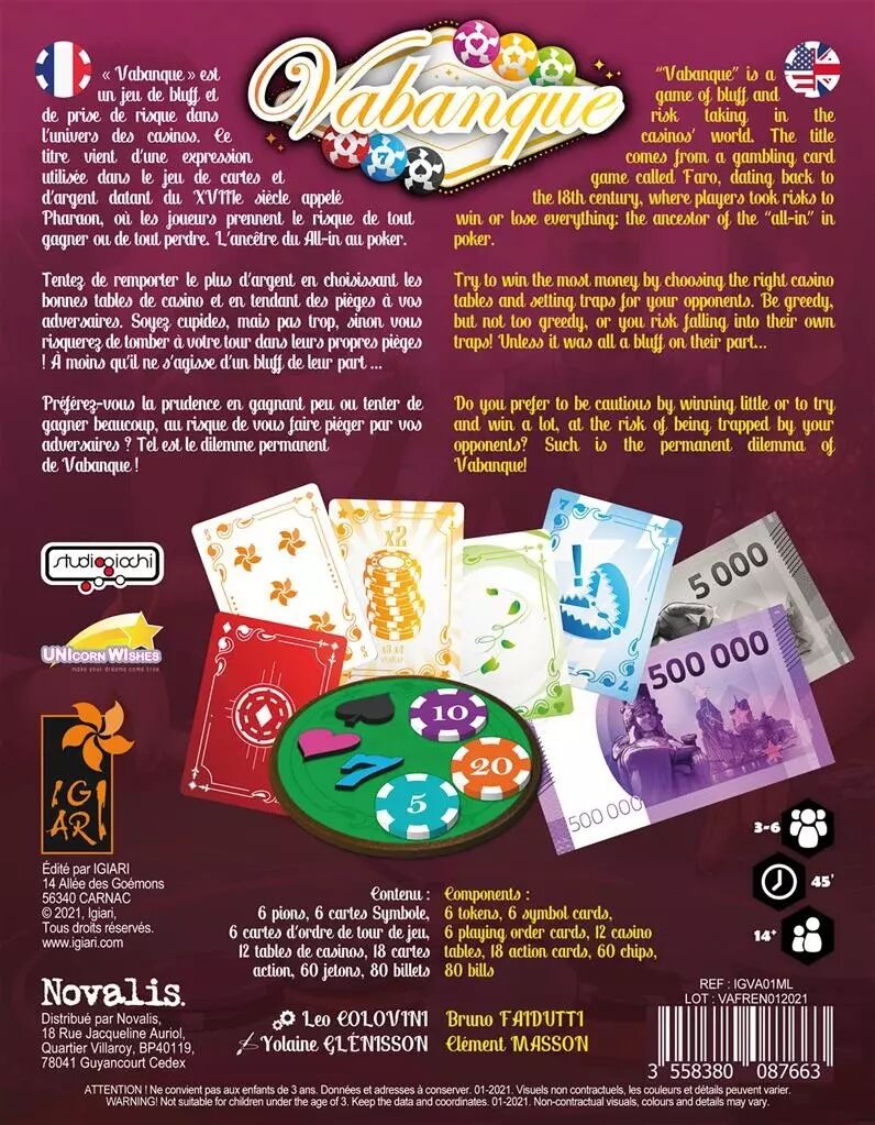Vabanque est un jeu de bluff et de prise de risque dans l’univers des casinos. Ce titre vient d’une expression utilisée dans le jeu d’argent datant du XVIIIe siècle appelé Pharaon, où les joueurs prennent le risque de tout gagner ou de tout perdre. L’ancêtre du All-in au poker.