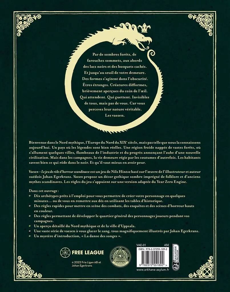 Vaesen – Le jeu de rôle d’horreur scandinave est un jeu de Nils Hintze basé sur l’œuvre de l’illustrateur et auteur suédois Johan Egerkrans. Vaesen propose un décor gothique sombre imprégné de folklore et d’anciens mythes scandinaves. Les règles du jeu s’appuient sur une version adaptée du Year Zero Engine.