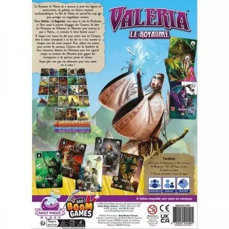 Partant de l'idée de base de Minivilles (acheter des cartes depuis une rivière pour construire son jeu, ces cartes étant ensuite activées à chaque tour via lancé de dés), Valeria : Le Royaume pousse davantage le concept, en y introduisant notamment la gestion de ressources... et le combat de monstres ! Recrutement de Citoyens, construction de Domaines, Objectifs secrets : la course à la victoire sera féroce... et attention au déclenchement de la fin de partie, qui peut intervenir plus rapidement que prévu !