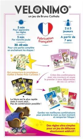 Soyez le premier à vous défausser de toutes vos cartes pour gagner les étapes de montagne et remporter le prestigieux maillot à Petits-Pois-Carottes...!Créez des combinaisons avec vos coureurs et soyez le premier à vous débarrasser de vos 11 cartes. Attention, les lièvres sont très rapides mais ils courent seuls, pas de combinaisons possibles ! Et les tortues, leaders d'équipes, ont une très faible valeur mais vous permettent de piocher chez l'adversaire, et ruiner sa stratégie ! Avec du sang-froid, apprenez à garder vos meilleures combinaisons pour prendre la main au bon moment et remporter l'étape. Usez de bluff pour pousser vos adversaires à se défausser trop tôt de leurs meilleures cartes, et partez à la conquête du maillot à Petits- Pois-Carottes ! Un jeu de défausse richement illustré, simple et absolument addictif !