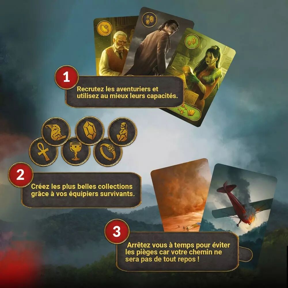 Le but du jeu est de marquer le plus de points de victoire en recrutant des aventuriers qui ont des capacités spéciales et qui vous permettent de relever des défis. Chaque joueur dispose d'une main de cartes qui représente son équipe. À chaque tour, les joueurs choisissent une carte pays parmi les cartes disponibles, puis ils tentent de recruter les aventuriers correspondants en jouant des cartes de leur main. Mais attention, il faudra aussi faire attention aux cartes des autres joueurs, qui peuvent vous voler, vous manipuler ou vous gêner !