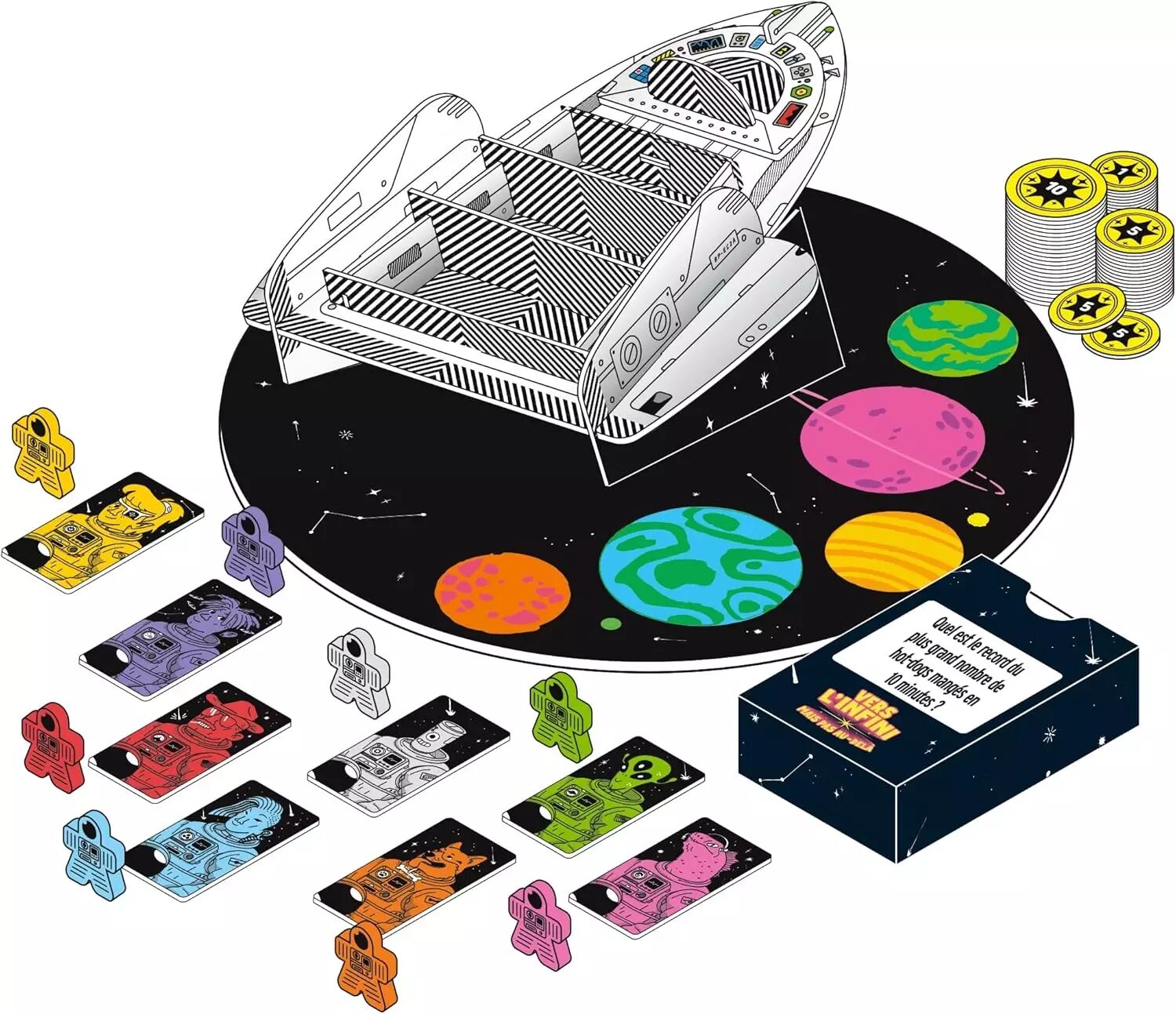 Dans la boîte : 1 vaisseau spatial 3D, 8 astro-meeples, 100 cartes question double-face, 1 distributeur de cartes, 8 jetons personnages, 50 pièces étoile, 1 plateau de jeu, règle du jeu complète