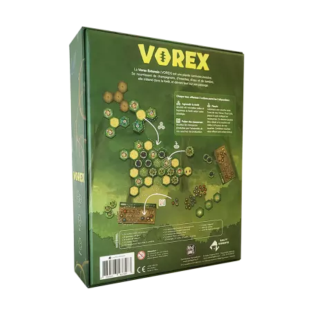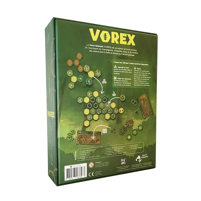 Découvrez Vorex, le premier jeu d'un nouvel éditeur qui vous plonge dans le rôle original de plantes carnivores. En incarnant ces végétaux vous devrez vous nourrir de champignons, d'insectes, d'eau et de lumière au cœur d'une forêt luxuriante. Pour survivre, vous devrez puiser ingénieusement dans les ressources environnantes et les exploiter pour faire fleurir votre existence. Plus votre "colonie" s'étendra, moins vous dépendrez des ressources extérieures. Toutefois, soyez prêt à affronter les autres joueurs qui ne vous laisseront pas faire ! Vous devrez vous étendre stratégiquement tout en gardant un œil sur les objectifs de fin de partie et en cherchant à entraver vos adversaires. Agrandissez habilement la forêt à votre avantage en posant des tuiles. Le jeu devient alors plus complexe, avec l'ajout de ressources, de coûts variables selon les fleurs connectées et d'objectifs à atteindre. Cette richesse de mécanismes rend Vorex particulièrement intéressant pour un public familial, tout en conservant son attrait pour les joueurs plus expérimentés.