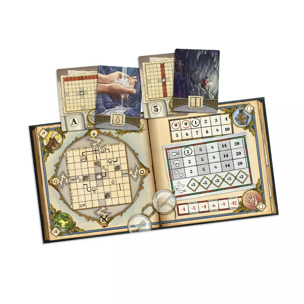 Voyage au Centre de la Terre est un jeu de flip & write où les joueurs font des choix simultanément pour trouver leur chemin et revenir entiers. Ouvrez la voie, collectez des espèces disparues, remplissez votre gourde d’eau et surtout évitez les dangers…
