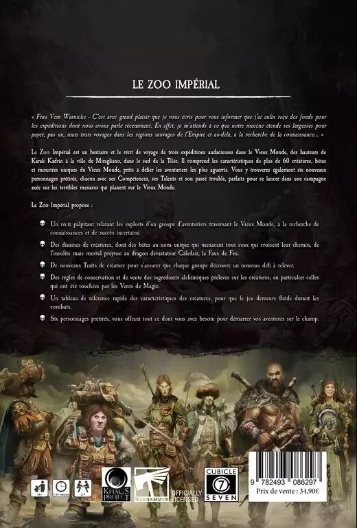 Le Zoo Impérial est un bestiaire et le récit de voyage de trois expéditions audacieuses dans le Vieux Monde, des hauteurs de Karak Kadrin à la ville de Miragliano, dans le sud de la Tilée.