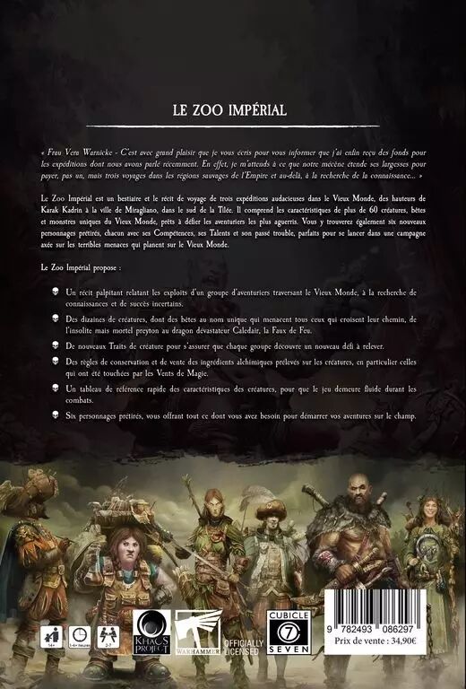 Le Zoo Impérial est un bestiaire et le récit de voyage de trois expéditions audacieuses dans le Vieux Monde, des hauteurs de Karak Kadrin à la ville de Miragliano, dans le sud de la Tilée. Il comprend les caractéristiques de plus de 60 créatures, bêtes et monstres uniques du Vieux Monde, prêts à défier les aventuriers les plus doués.