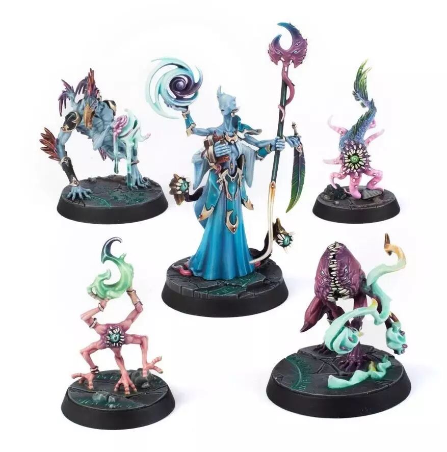 - La bande du Pandémonium d'Ephilim complète. Un invocateur agenre consacré à Tzeentch, Ephilim, tient des objets magiques et des sorts dans ses membres filiformes, et est accompagné d'une horde de familiers démoniaques bizarres, qui ne ressemblent à aucune créature ayant déjà parcouru les Royaumes Mortels. Assemblez rapidement votre bande avec cinq figurines à emboîter, moulées en plastique bleu gris pour ressortir même sans être peintes. Elles sont accompagnées de leurs cartes de combattant et d'une pile de Rivaux complète