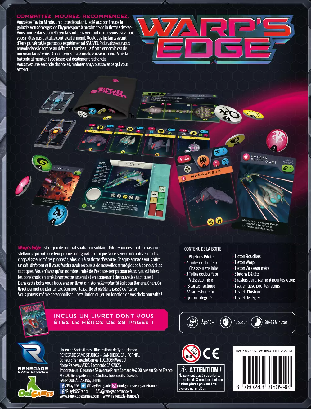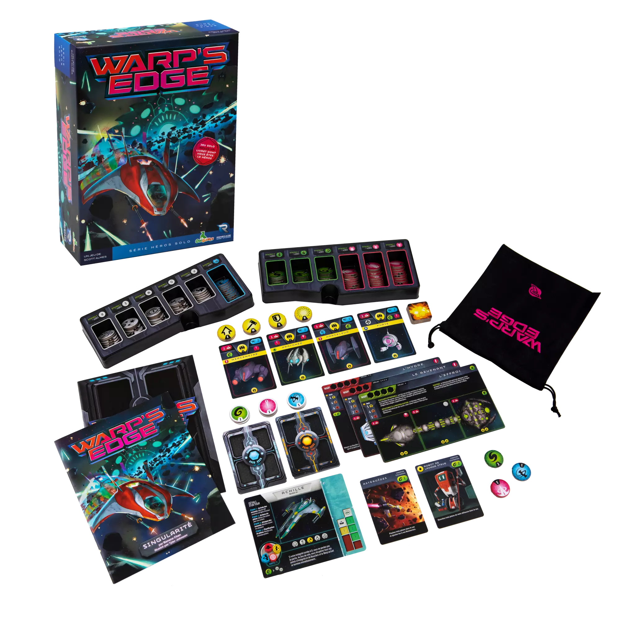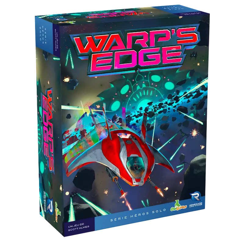 Warp's Edge est un jeu solo. Améliorez au cours de la partie votre réserve de jetons. Au fur et à mesure que vous les piochez sans regarder dans le sac, attribuez-les aux cartes ennemies. Attaques, manœuvres, énergie, autant d'atouts pour perfectionner vos tactiques. À chaque fois que vous serez pulvérisé par l'ennemi, jouez une nouvelle manche, avec toujours plus de jetons. Tous les ennemis reviennent comme à la mise en place de départ. Mais vous n'avez qu'un nombre limité de manches, dont l'une devra voir votre victoire sur l'ensemble de l'escadrille ennemie ET de son vaisseau mère. Modifiez la mise en place du jeu avec le livret d'histoire dont vous êtes le héros de 28 pages.