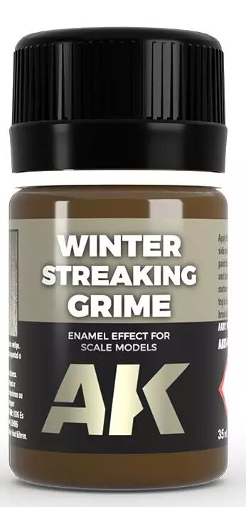 Le Winter Streaking Grime d'AK Interactive est une enamel formulée spécifiquement pour le weathering hivernal des véhicules militaires et blindés. Ce flacon de 35ml renferme une teinte gris clair qui reproduit fidèlement les accumulations de boue, neige fondue et poussière qui s'encrassent sur les surfaces peintes en blanc ou camouflage hivernal.