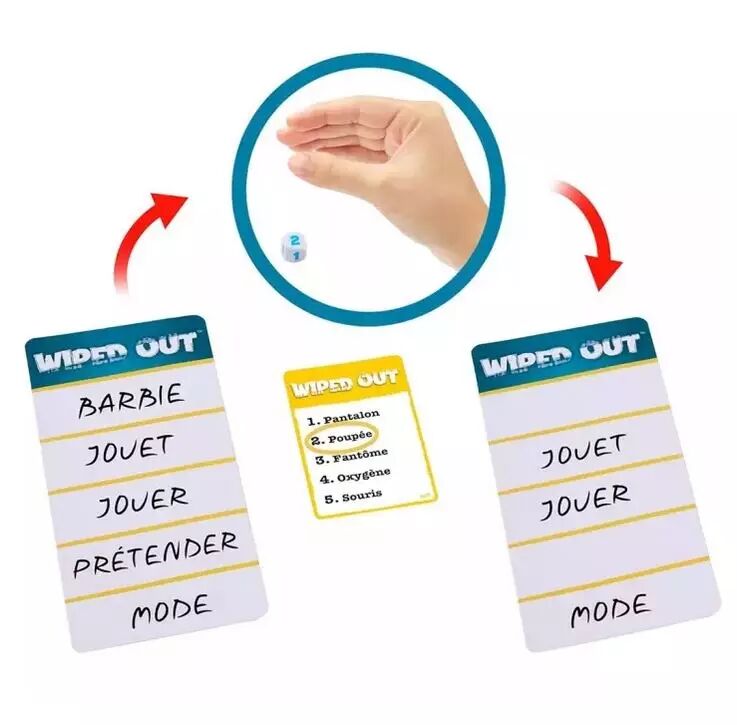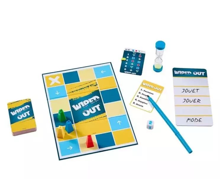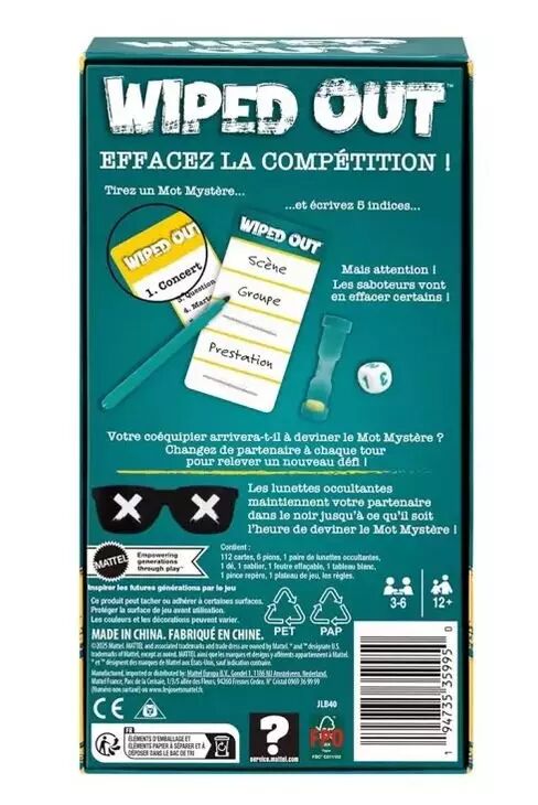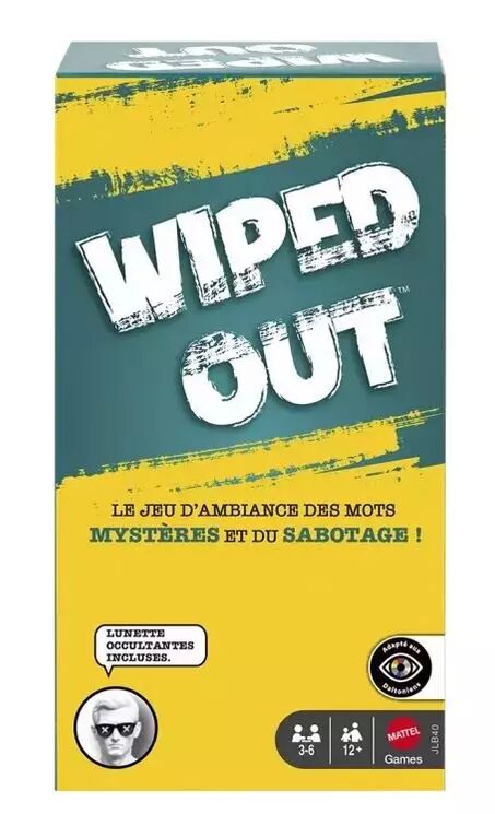 Préparez-vous à saboter vos adversaires avec le jeu de société Wiped Out ! Faites équipe avec un joueur différent à chaque tour et travaillez ensemble pour deviner un mot secret. Les lunettes occultantes cachent, avec style, la vue du devineur, tandis que son coéquipier écrit 5 indices pour l’aider à trouver le mot secret. Mais attention ! Les autres joueurs lui compliquent la tâche en effaçant jusqu’à trois de ces indices ! Les couleurs et les décorations peuvent varier.