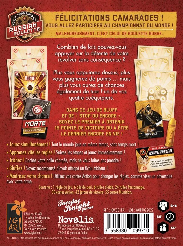Chaque joueur contrôle un capitaine et ses trois acolytes. Mélangez vos 6 cartes « clic » avec une carte « Bang » et choisissez-en une que vous planquez dans votre manche. Secrètement, indiquez le nombre de fois où vous appuyez sur la gâchette. Une fois les paris révélés, tous en même temps, les joueurs retournent la première carte, si c’est un clic, continuez. Si c’est un bang un de vos sbires ou vous êtes mort. Les joueurs arrivant vivant à la fin de leur pari remportent des points de victoire, plus vous avez pris de risques, plus vous en gagnez.