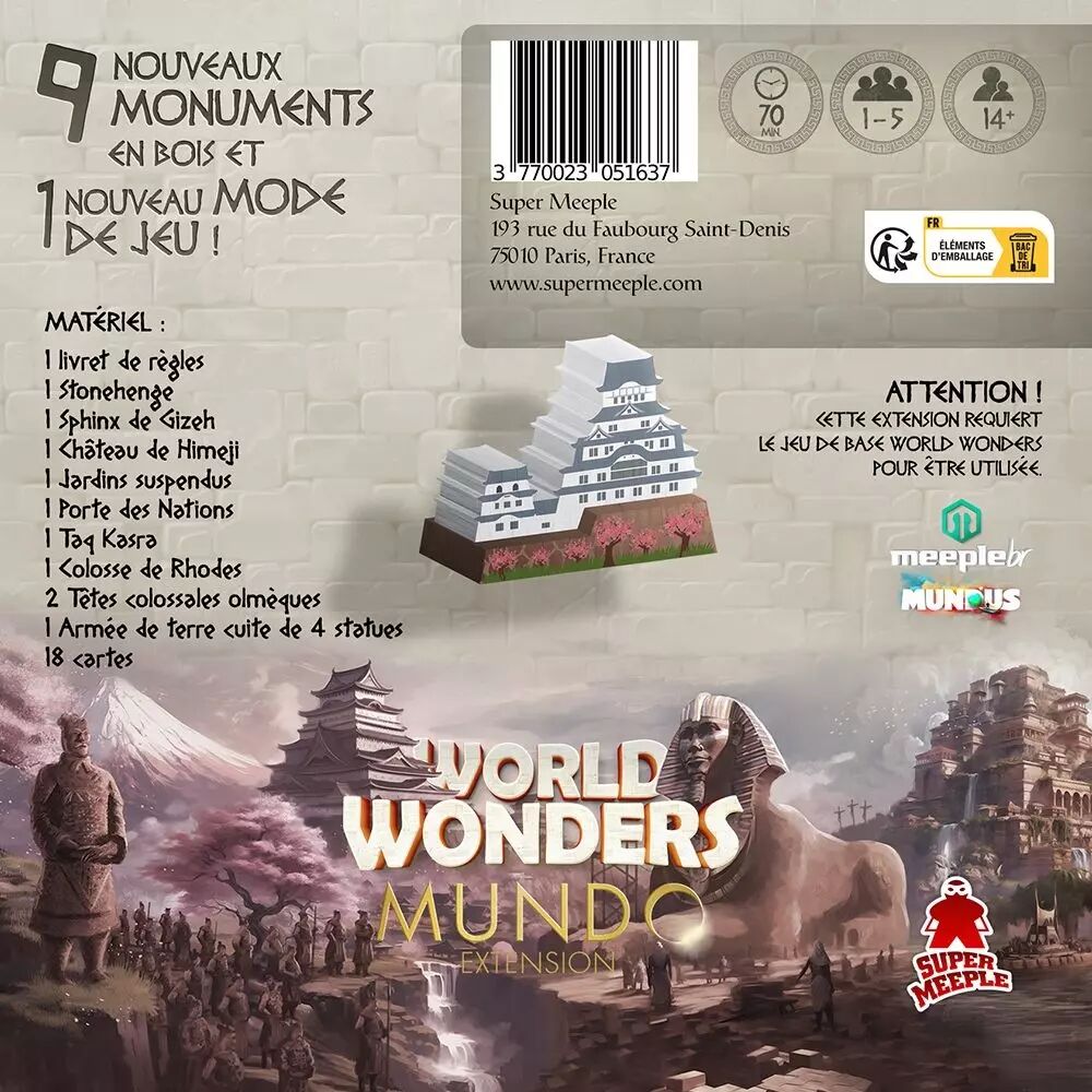 Si vous êtes un fan de World Wonders, l'extension Mundo est un must-have ! Elle vous permettra de découvrir de nouvelles merveilles du monde antique, de vivre des parties encore plus stratégiques et de vous amuser encore plus avec vos amis et votre famille.