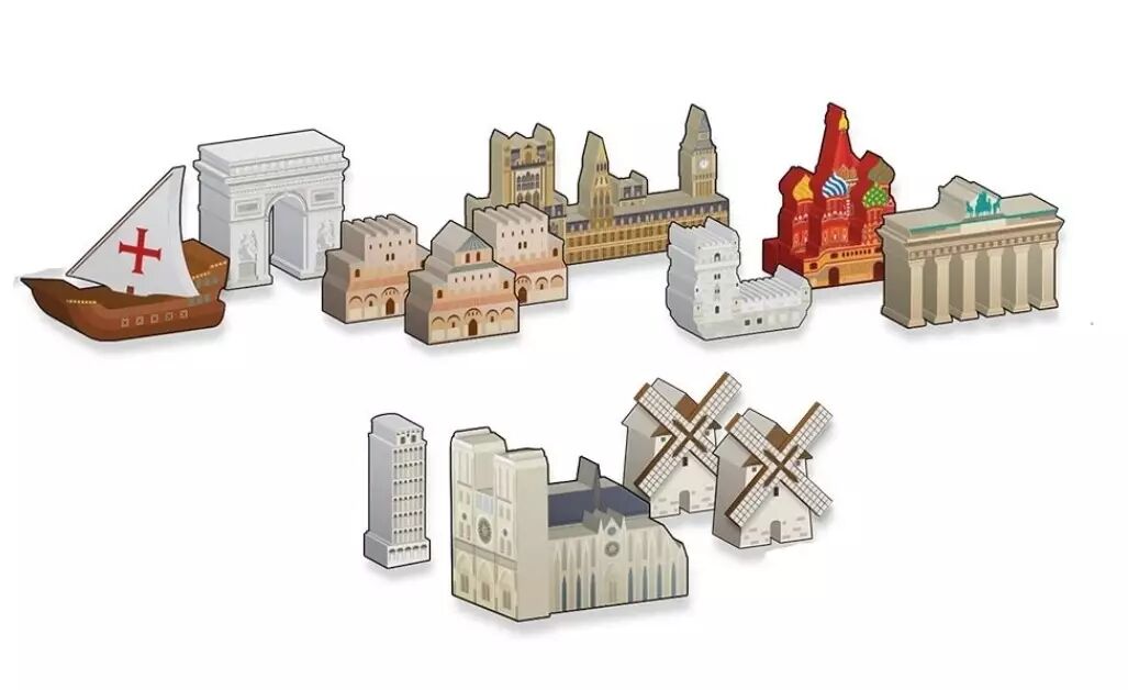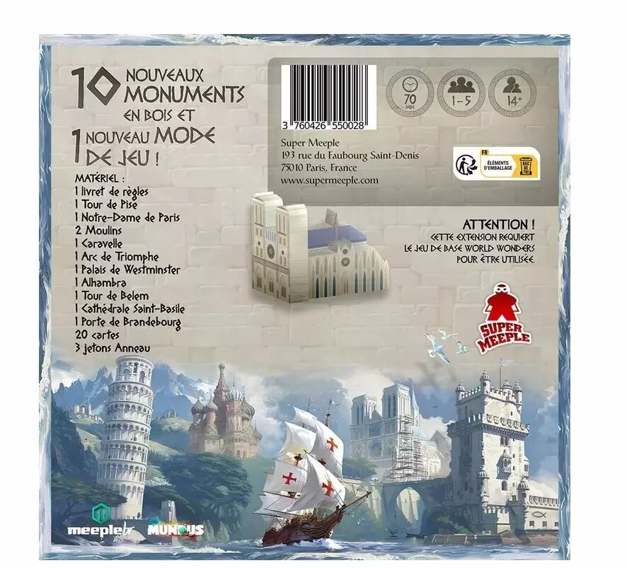 La boîte Europa propose 10 monuments européens en bois (dont la Tour de Pise, Notre-Dame, Arc de Triomphe…), 20 cartes, 3 jetons Anneaux et un livret de règles. Elle se combine parfaitement avec les autres extensions pour offrir une expérience de jeu toujours renouvelée, plus riche et interactive, une vraie invitation à redécouvrir World Wonders sous tous ses aspects.