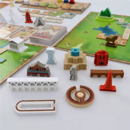 World Wonders est doté d'un matériel de qualité avec des monuments en bois peints et des plateaux recto-verso qui offrent deux environnements différents. Le jeu est également livré avec des cartes objectif et un mode solo pour encore plus de possibilités de jeu.