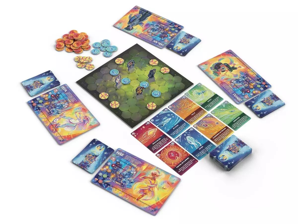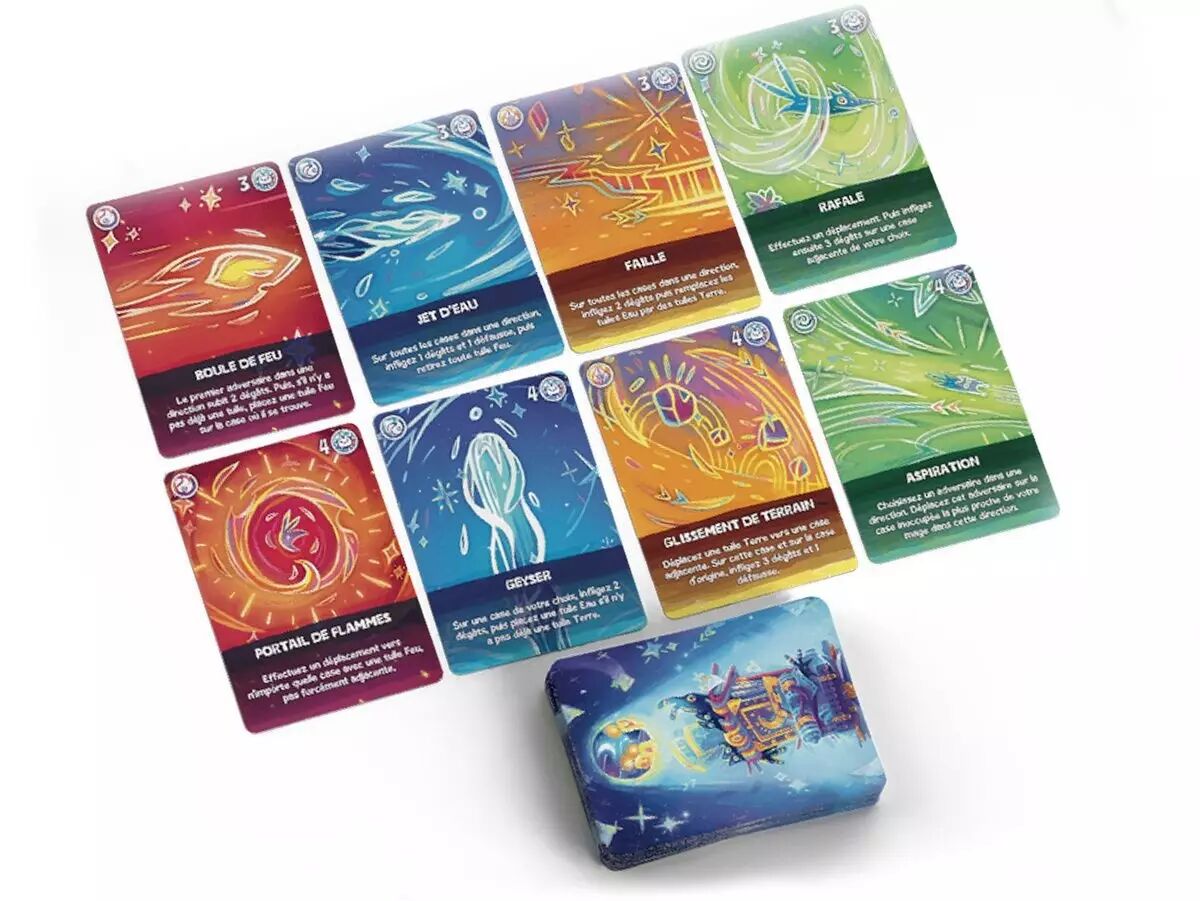Wyz innove en proposant un deckbuilding léger et immédiatement accessible. Vous commencez tous avec les mêmes sorts basiques, puis enrichissez graduellement votre grimoire en ciblant les sortilèges qui épousent votre style. Entre eau qui noie, feu qui carbonise, terre qui écrase et vent qui emporte, les voies de la magie sont multiples.