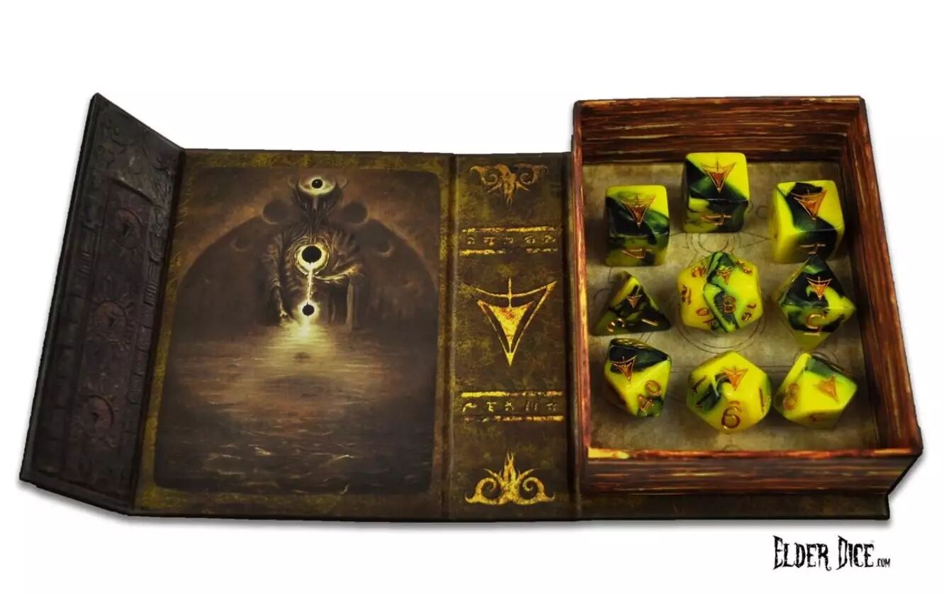 Chaque ensemble de Elder Dice comprend la gamme complète des neuf dés de jeu polyédriques : 1 dé à quatre faces, 3 dés à six faces, 1 dé à huit faces, 1 dé à dix faces, 1 dé à dix faces pourcentile, 1 dé à douze faces et 1 dé à vingt faces. Le tout est soigneusement emballé dans une boîte de style livre de sorts assortie, dotée d’une fermeture magnétique. Ses dimensions intérieures sont de 2,75 pouces sur 3,75 pouces.