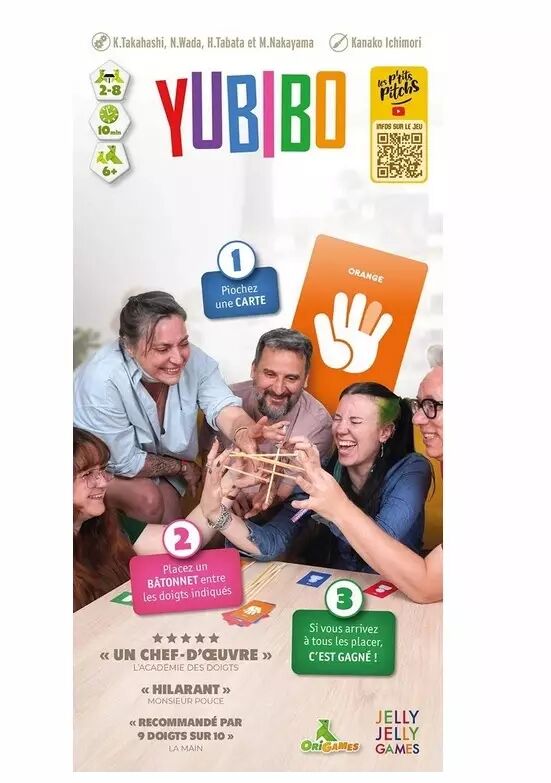 Yubibo combine habilement adresse, équilibre et coopération dans un format simple à comprendre, mais totalement captivant. Les joueurs relient leurs doigts à l’aide de bâtonnets sur base des cartes tirées, créant une structure fragile qui demande concentration et coordination.