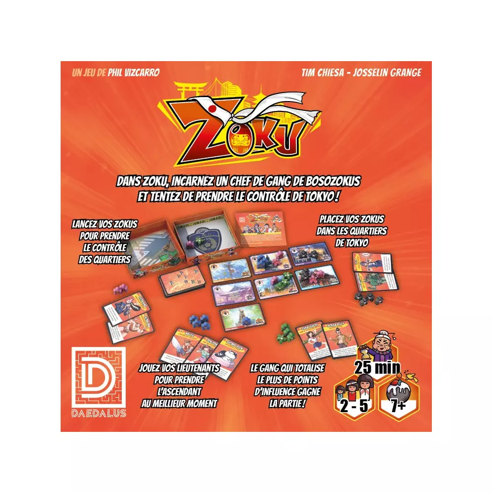 Dans Zoku, vous incarnez le chef d’une bande de Bosozoku. Vous tenterez de prendre le contrôle d’Arrondissements de Tokyo représentés par des cartes en y plaçant vos Zokus, représentés par des meeples. Vous ferez s’affronter vos bandes dans les quartiers en jetant dans la boîte vos meeples. En fonction de leur position à l’arrivée, certains meeples seront éliminés et vous aurez 3 tentatives pour déterminer le vainqueur de la carte du quartier. Attention, en cas d’égalité, la police débarquera et emmènera au poste une partie de vos Zoku. Vous aurez aussi à votre disposition des lieutenants qui vous permettront d’obtenir des avantages en cours de partie.