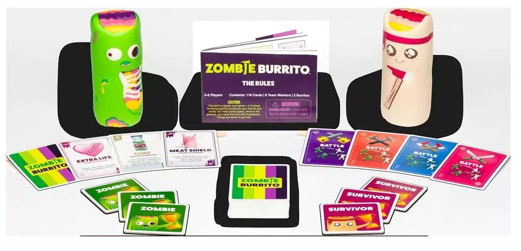 Mélange de jeu de cartes et de jeu physique avec les burritos en mousse.